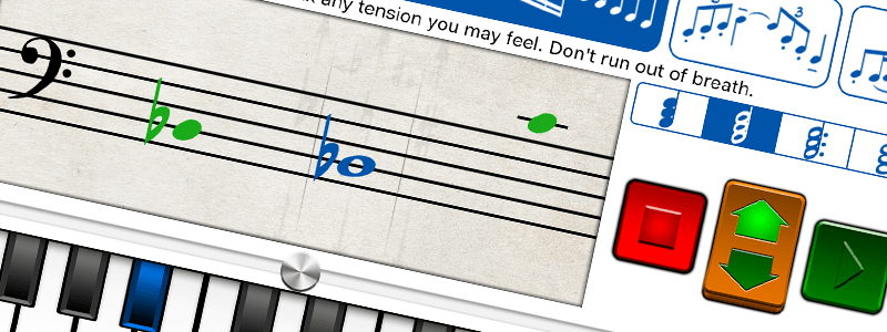 - Pick a starting note from the keyboard or the musical staff (green note) in treble or bass clef. (The range of the exercise will be displayed in blue).